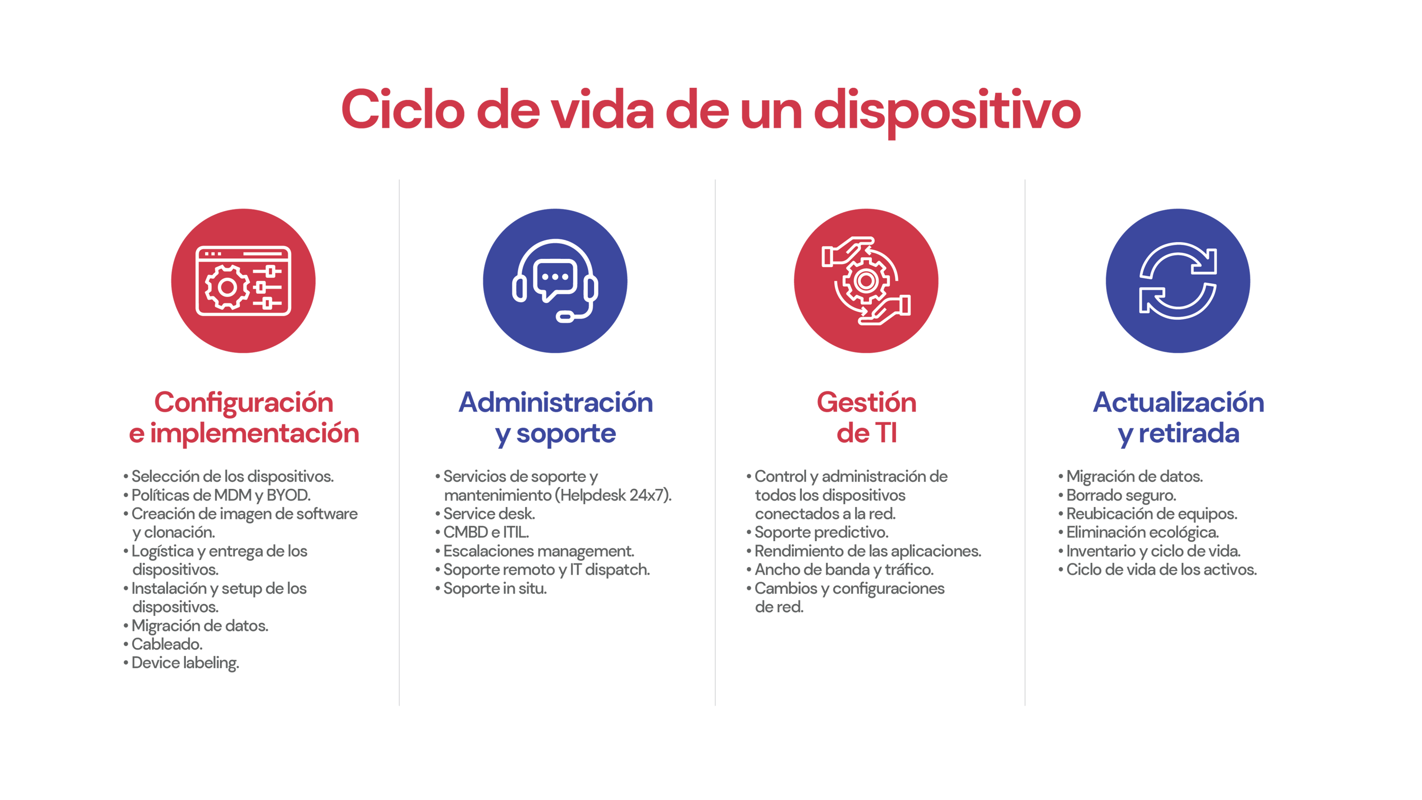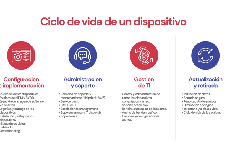 Nuestro servicio cubre una amplia necesidad de requerimientos de los departamentos de TI a lo largo del ciclo de vida útil de los dispositivos, desde la configuración e implementación de los dispositivos hasta la reubicación y descarte de los mismos.